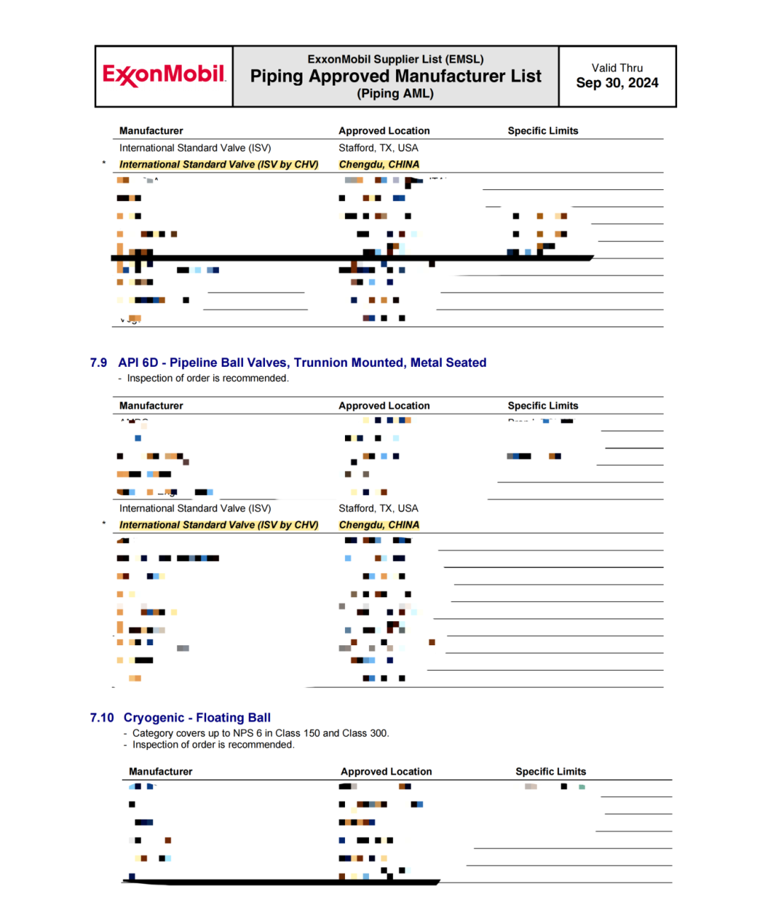 在美国埃克森美孚(ExxonMobil)最新发布的批准供应商列表(AML)中,成都成高阀门股份有限公司(CHV)在以下产品分类中获得正式批准: