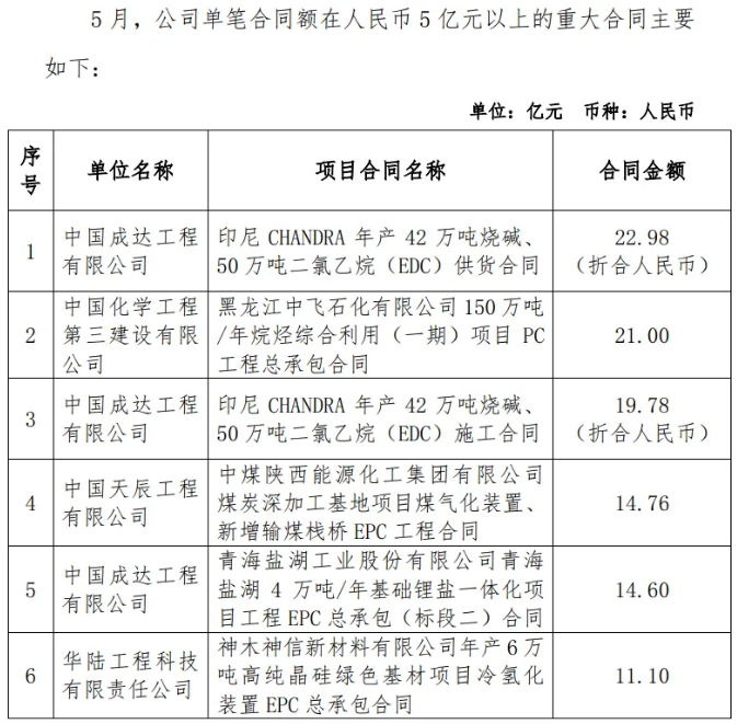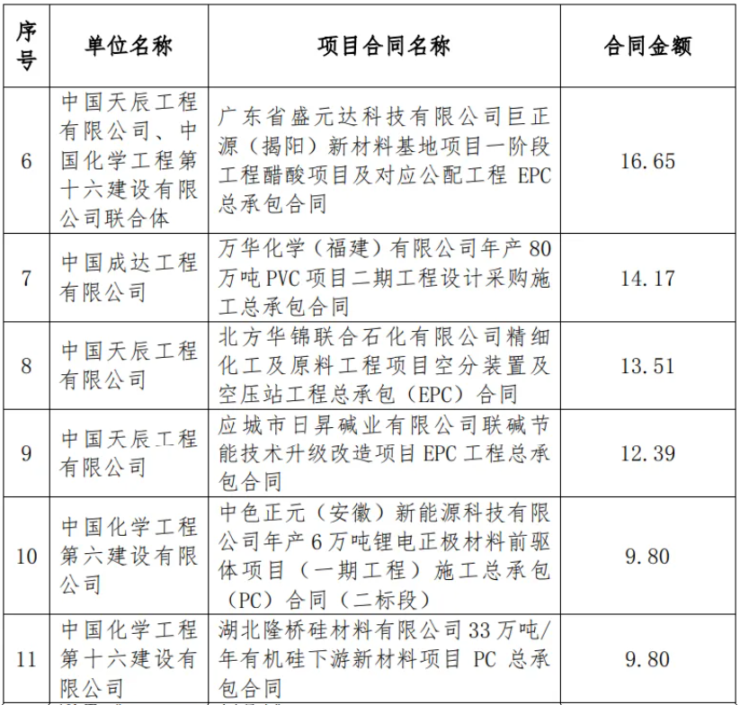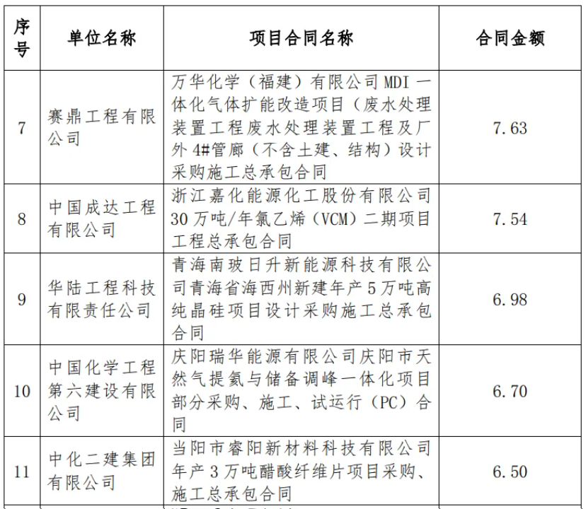 该项目建设内容为30万吨/年氯乙烯(VCM)主装置及配套辅助设施,建设单位为中国成达工程有限公司,合同金额7.54亿元。