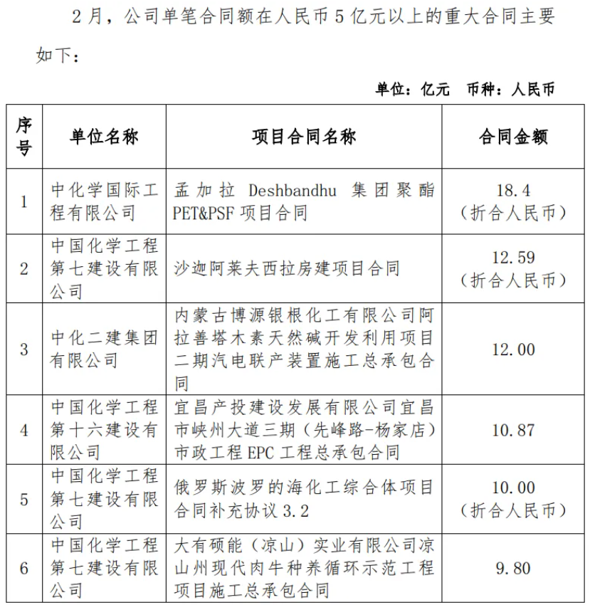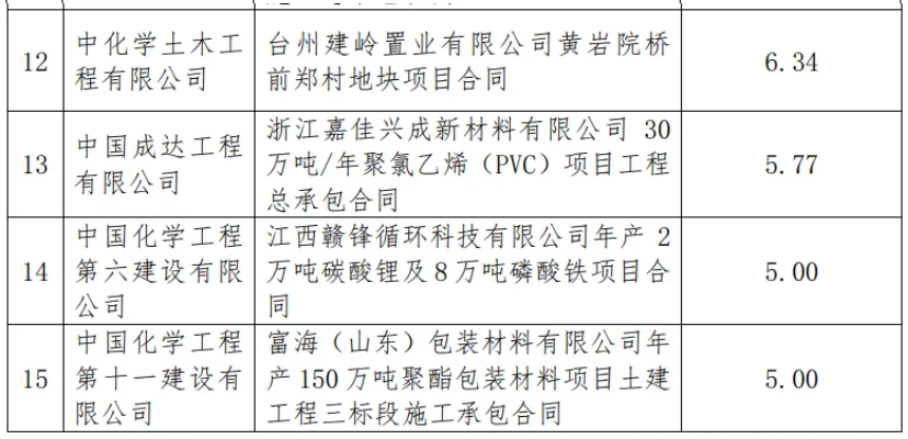 1-6月,中国化学共签订2749个项目,其中,单笔超过5亿元的项目有73个(具体清单见文章尾部),涉及包括万华化学、荣盛石化、湖北宜化、东粤化学、大全新能源、翔福新能源等多个巨头的项目,单笔最大金额高达81.8亿元,为中国五环在埃及签约的三期化肥项目总承包合同。