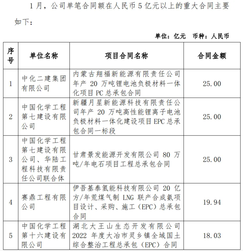 该项目落地于自贡川南新材料化工园区,EPC合同金额达28.8亿元。主要以天然气为原料,生产乙醇、氯碱,再生产醋酸的下游产品,配套新能源锂电池电解液生产,投产后预计年产值300亿元。