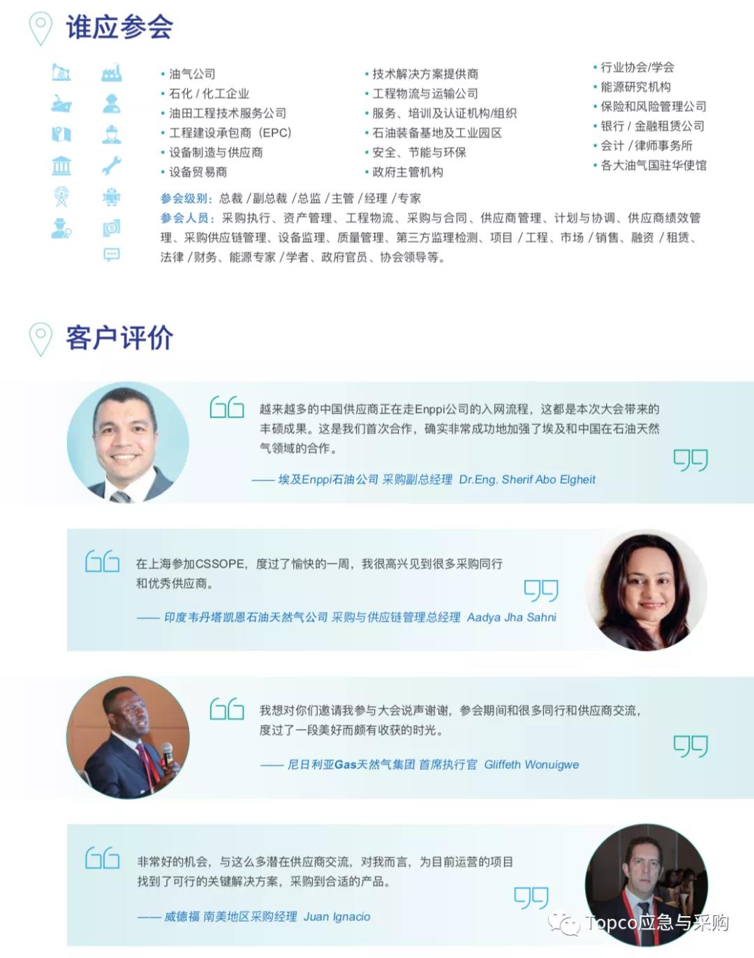 诚邀参与,与来自全球的国有石油公司、国际石油公司、国际服务供应商&工程、采购商、EPC承包商、贸易商、库存商、电商平台等采购人士齐聚一堂,建立贸易伙伴关系,共谋最新解决方案和采购战略,开展业务,共创未来。