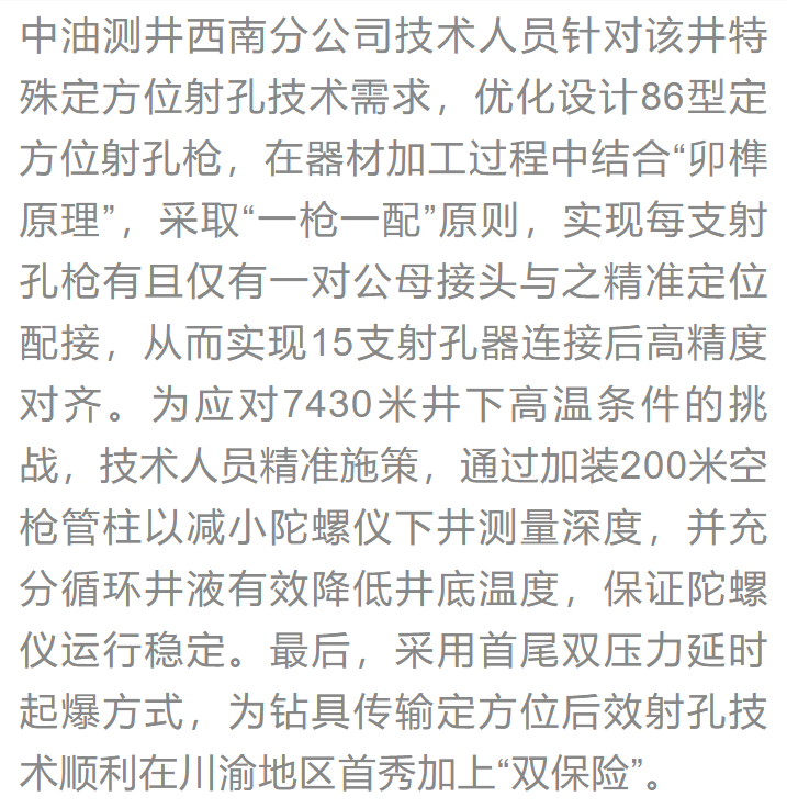 近期,中油测井西南分公司运用钻具传输定方位后效射孔技术,顺利完成西南油气田公司部署在蓬莱气区的重点预探井蓬深1井的射孔作业,创下国内钻具传输定方位射孔井深最深7430米、井温最高172摄氏度新纪录。