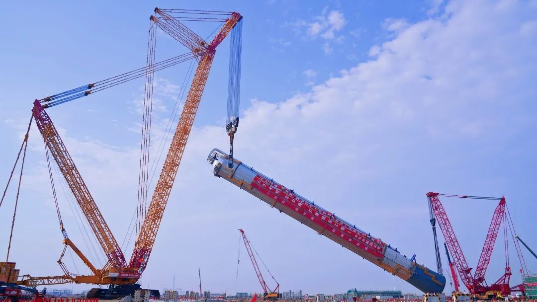 本次吊装使用XGC88000型4000吨级履带式起重机和M21000型1000吨级履带式起重机,采用单主机抬吊递送法就位。其中起运公司自有设备4000吨级履带式起重机,是承载中国技术、中国制造、中国工程的“大国重器”,先后扬威海内外近20个大型重点项目,吊装总重量超过10万吨,被央视誉为“国家砝码”。